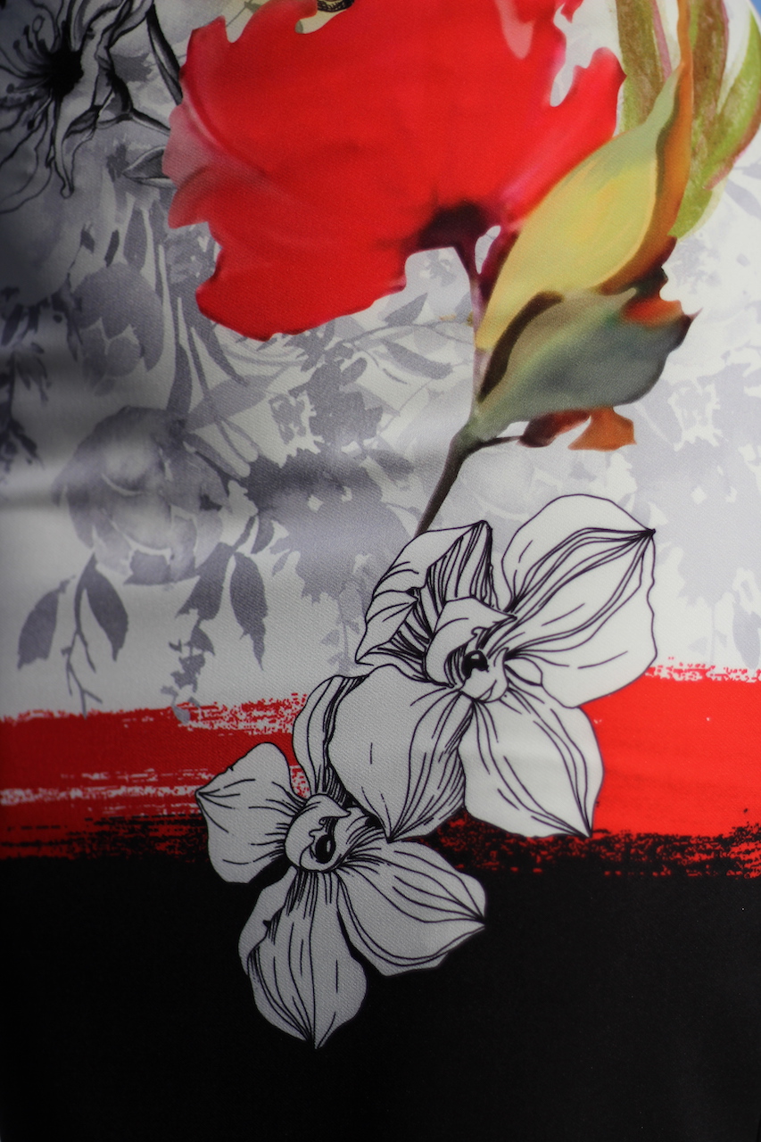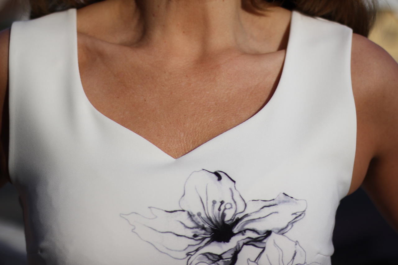 elegantes Kleid in weiß mit Herzausschnitt Bordure und Blumendruck mit Reißverschluss