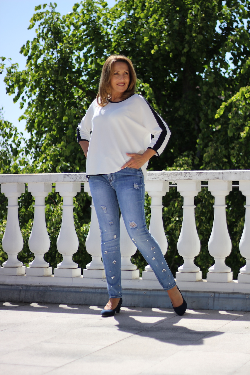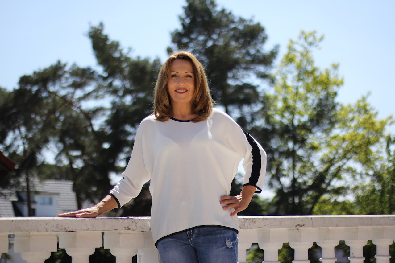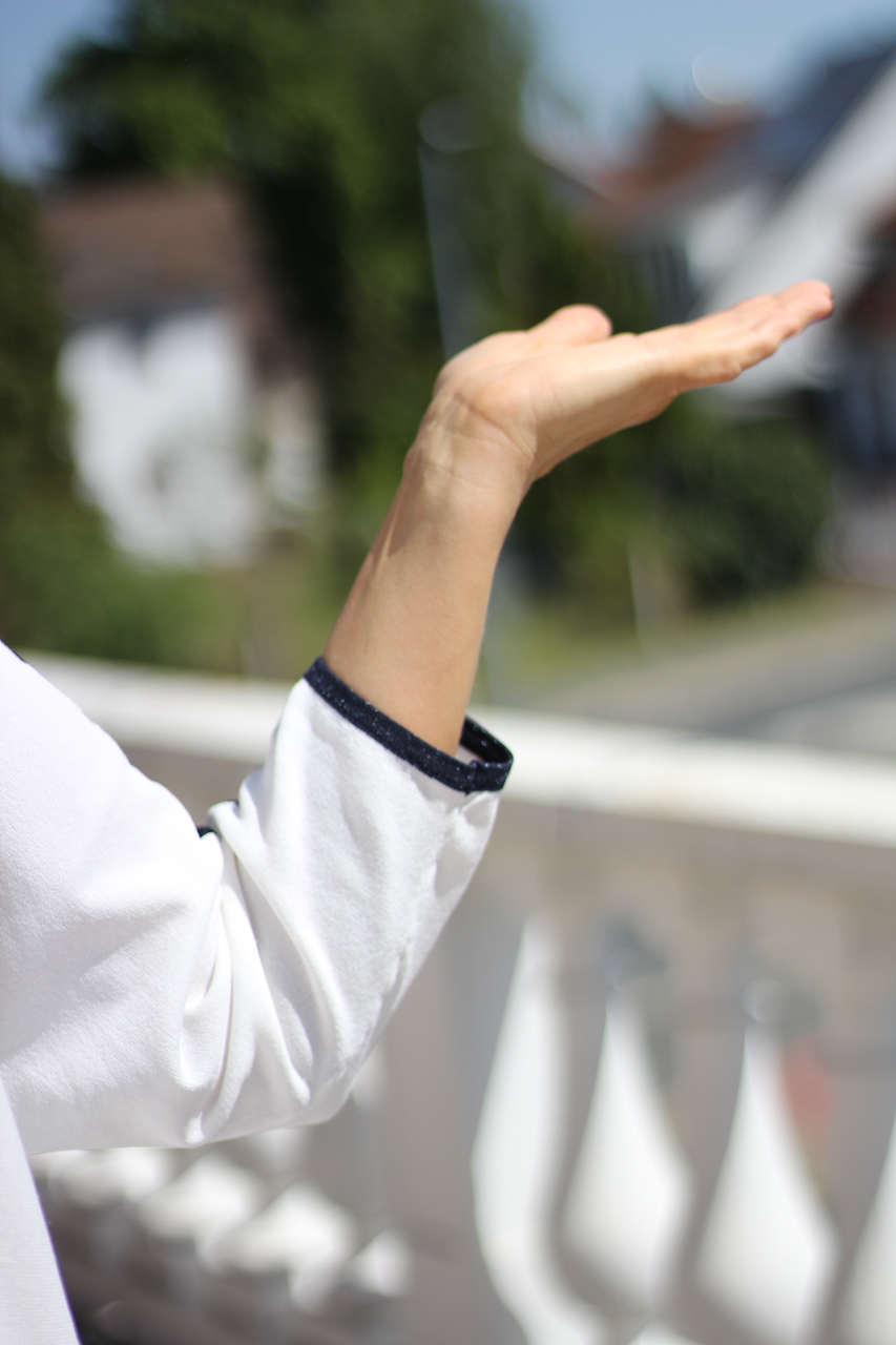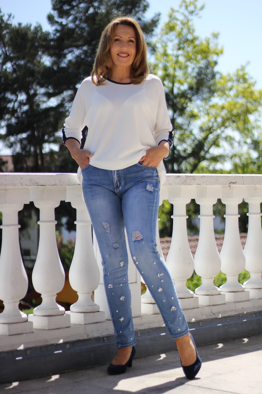 Weiterführende Links zu "weißer Feinstrickpulli mit schwarzer Glitzerleiste am Hals und Ärmel in ONE SIZE"
