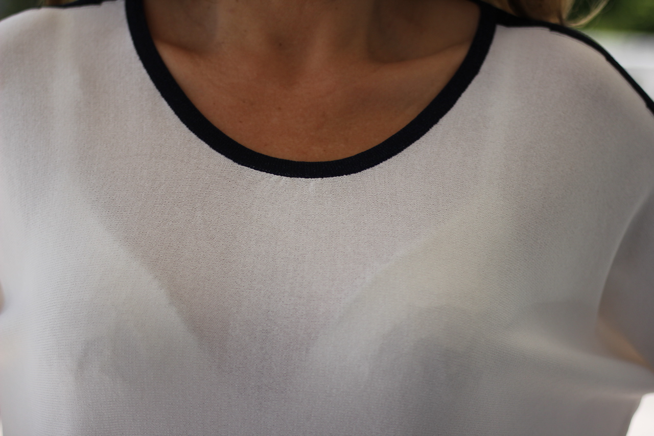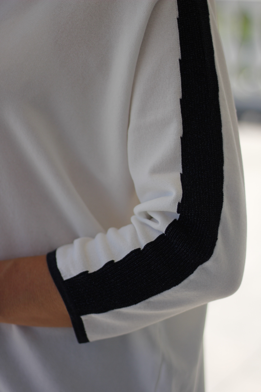weißer Feinstrickpulli mit schwarzer Glitzerleiste am Hals und Ärmel in ONE SIZE