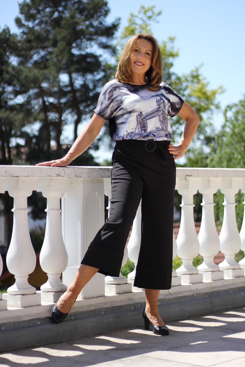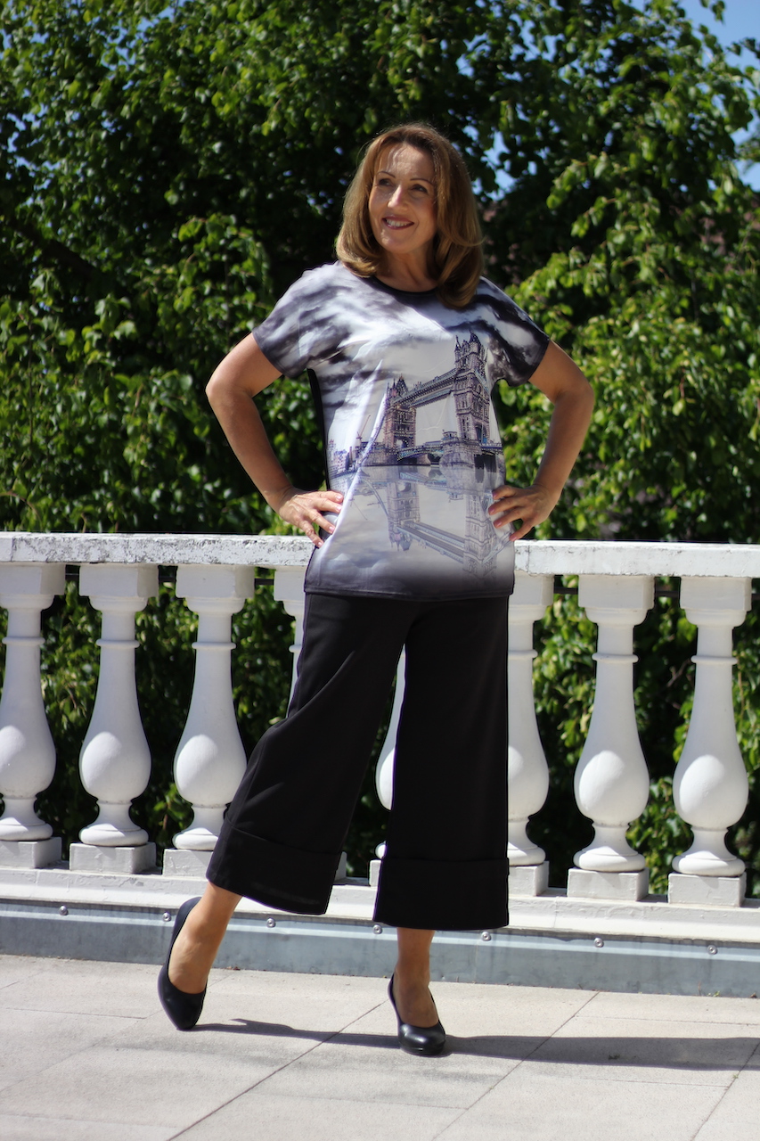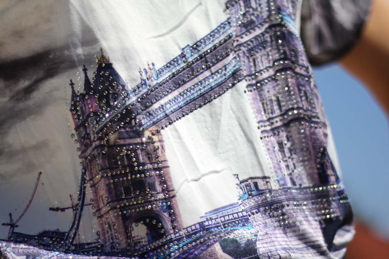 grau-schwarzes T-Shirt mit Motiv ´Towerbridge´ mit Glitzersteine in Größe S/M